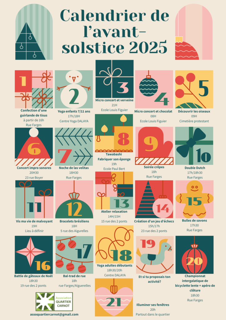 L’association QUARTIER CARNOT organise, le Samedi 27 Septembre, un vide-ateliers d’artistes : Le Carnot à Dessins. Plus d’informations sur notre page dédiée: Carnot à dessins 2025.